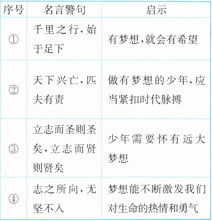 (1)①编织人生梦想,是青少年时期的重要主题,它能不断激发我们对生命的热情和勇气,让生活更有色彩。②因为有了梦想,人类社会才能不断发展和进步。③做有梦想的少年,应当树立远大志向。④做有梦想的少年,应当紧扣时代脉搏。