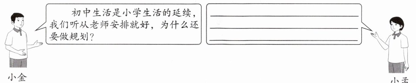 老师布置任务、提出要求后,同学们开始按要求组建了各自的小组,但是有的同学不理解为什么要规划初中生活。下面是他们的对话: