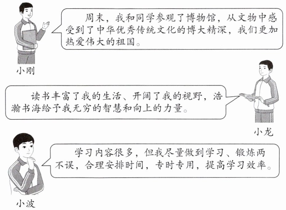 15.①小刚参观博物馆也是学习。学习并不局限在学校,我们生活中的所看、所听、所尝、所触、所做,都可以是学习。②要像小龙那样热爱学习,学习是我们现阶段的基本任务,也是我们成就梦想的重要路径。学习可以提升我们的思想品德和精神境界,增强能力,增长智慧,使我们面前的世界更广阔、更精彩,让我们拥有实现梦想的持续力量。③要像小波那样善于学习,养成良好的学习习惯,掌握科学的学习方法,提高学习效率。