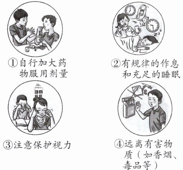 2.D 解析:本题考查爱护身体。爱护身体就要有健康的生活方式,②③④均是健康的生活方式;①做法不正确,我们吃药要遵照医嘱来吃,不能乱吃。