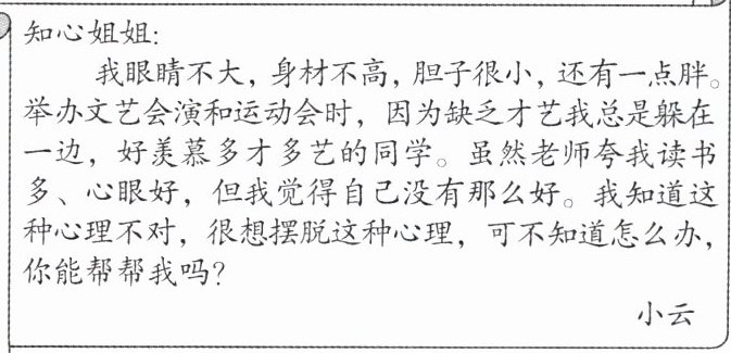 2.C 解析:本题考查学会接纳自己。根据小云同学写给知心姐姐的一封信,我给小云的合理建议是人无完人,接纳自己的不完美,相信自己,发现你的独特优势,积极尝试,不断发掘自身潜能,①③④说法符合题意;②说法错误,我们应正确对待他人的评价。