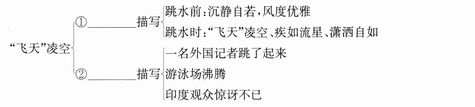 $\left\{\begin{array}{l}①$______$描写\left\{\begin{array}{l}跳水前:沉静自若,风度优雅\\跳水时:“飞天”凌空、疾如流星、潇洒自如\end{array} \right.\\②$______$描写\left\{\begin{array}{l}一名外国记者跳了起来\\游泳场沸腾\\印度观众惊讶不已\end{array} \right.\end{array}\right.\right.$