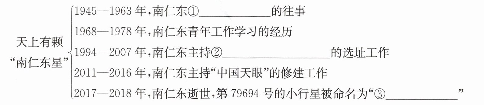 $\left\{ \begin{array} { l } { 1 9 4 5 - 1 9 6 3 \text { 年,南仁东①$_________$的往事 } } \\ { 1 9 6 8 - 1 9 7 8 \text { 年,南仁东青年工作学习的经历 } } \\ { 1 9 9 4 - 2 0 0 7 \text { 年,南仁东主持②$_________$的选址工作 } } \\ { 2 0 1 1 - 2 0 1 6 \text { 年,南仁东主持“中国天眼”的修建工作 } } \\ { 2 0 1 7 - 2 0 1 8 \text { 年,南仁东逝世,第 } 7 9 6 9 4 \text { 号的小行星被命名为“③$_________$” } } \end{array} \right.$