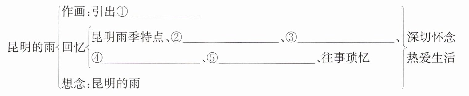 昆明的雨$\begin{cases} 作画:引出①$______$ \\ 回忆\begin{cases} 昆明雨季特点、②$______$、③$______$、④$______$、⑤$______$、往事琐忆 \\ \end{cases}\\ \\ 想念:昆明的雨 \\ \end{cases}\\ $深切怀念热爱生活