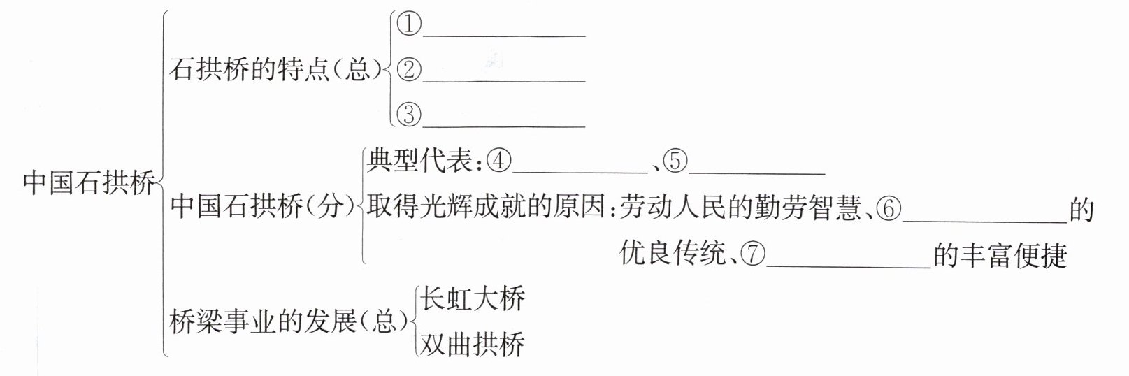 $\left\{ \begin{array} { l } { \text { 石拱桥的特点 (总) } \left\{ \begin{array} { l } { \text { ①$_________$ } } \\ { \text { ②$_________$ } } \\ { \text { ③$_________$ } } \end{array} \right. } \\ { \text { 中国石拱桥 (分) } \left\{ \begin{array} { l } { \text { 典型代表: ④$_________$、⑤$_________$ } } \\ { \text { 取得光辉成就的原因: 劳动人民的勤劳智慧、⑥$_________$的 } } \\ { \text { 优良传统、⑦$_________$的丰富便捷 } } \end{array} \right. } \\ { \text { 桥梁事业的发展 (总) } \left\{ \begin{array} { l } { \text { 长虹大桥 } } \\ { \text { 双曲拱桥 } } \end{array} \right. } \end{array}\right. } \right.$