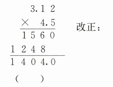 $\begin{array}{r} 3.12 \\ × 4.5 \\ \hline 1560 \\ 1248 \\ \hline 1404.0 \end{array} $