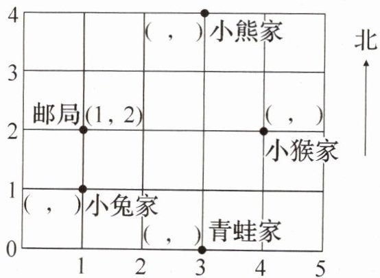 1. 小熊家(3,4) 小兔家(1,1)小猴家(4,2) 青蛙家(3,0)2.(3,2) (2,3)3. 28 km