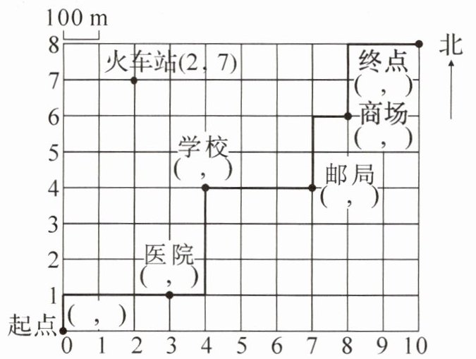 1. 起点(0,0) 医院(3,1)学校(4,4) 邮局(7,4)商场(8,6) 终点(10,8)2. 100 300 100 300 东 300 北200 东 100 北 200 东 200