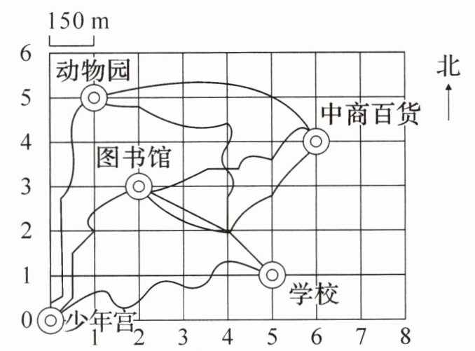 2. 图书馆的位置可以用( , )表示,它在少年宫( )。
