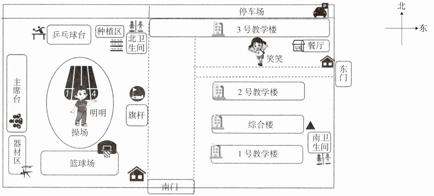 )。(3)笑笑如果站在 3 号教学楼的位置,她的 12 点钟方向是(
