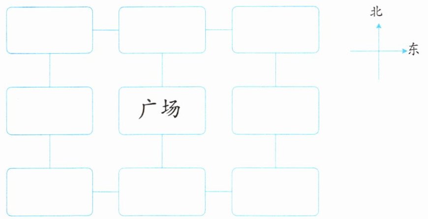 上行左列:饭店,上行中列:超市,上行右列:医院; 中行左列:书店,中行中列:广场,中行右列:笑笑家; 下行左列:公园,下行中列:淘气家,下行右列:商场。