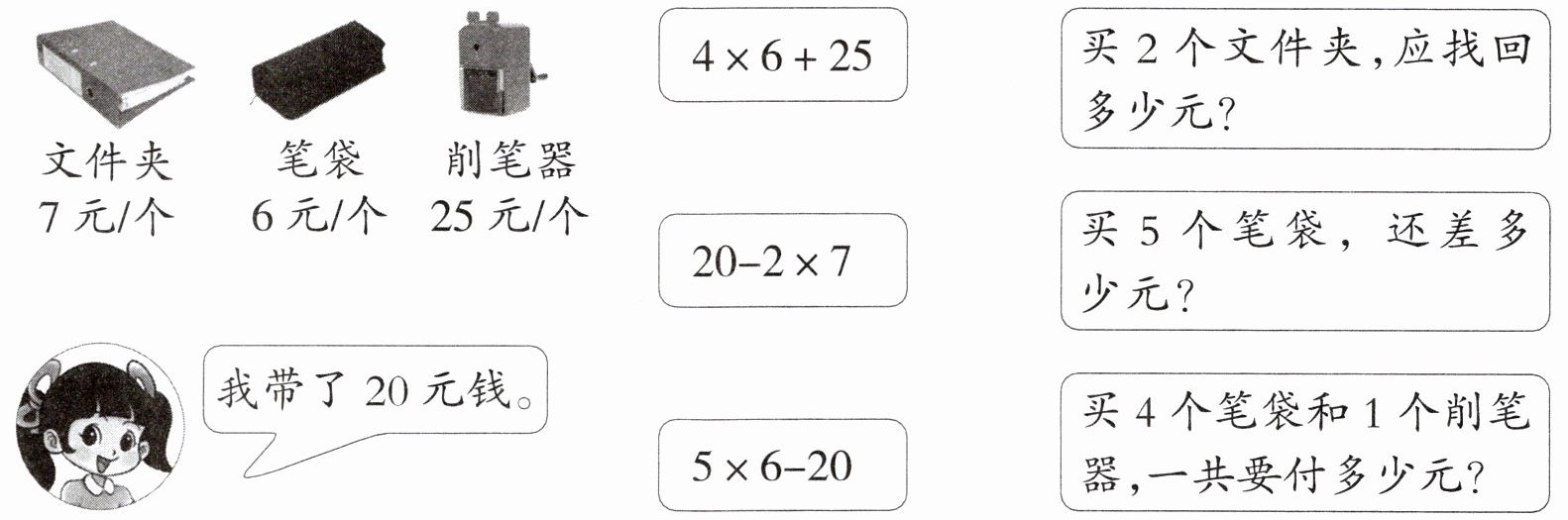 文件夹连$20 - 2×7$;笔袋连$5×6 - 20$;削笔器连$4×6 + 25$