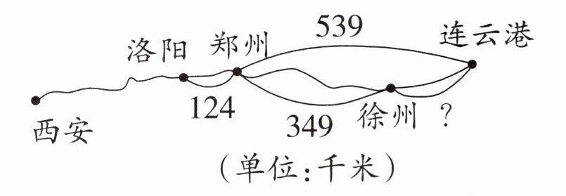 由图可知,郑州到徐州的距离为349千米,郑州到连云港的距离为539千米。