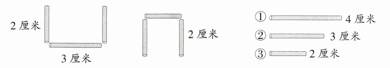 1. 下面的图形要想分别摆成长方形和正方形,选哪根小棒最合适?填序号。