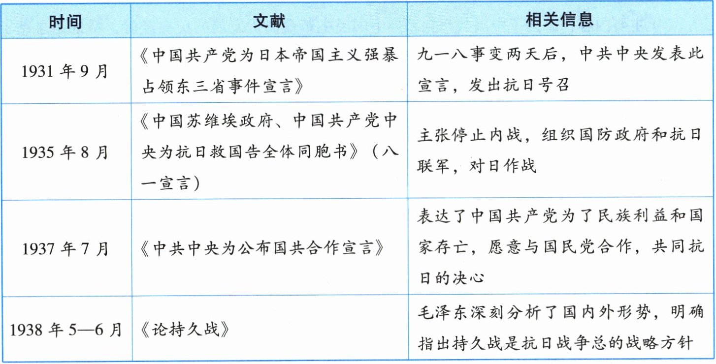 |1935 年 8 月|《中国苏维埃政府、中国共产党中央为抗日救国告全体同胞书》(八一宣言)|主张停止内战,组织国防政府和抗日联军,对日作战|