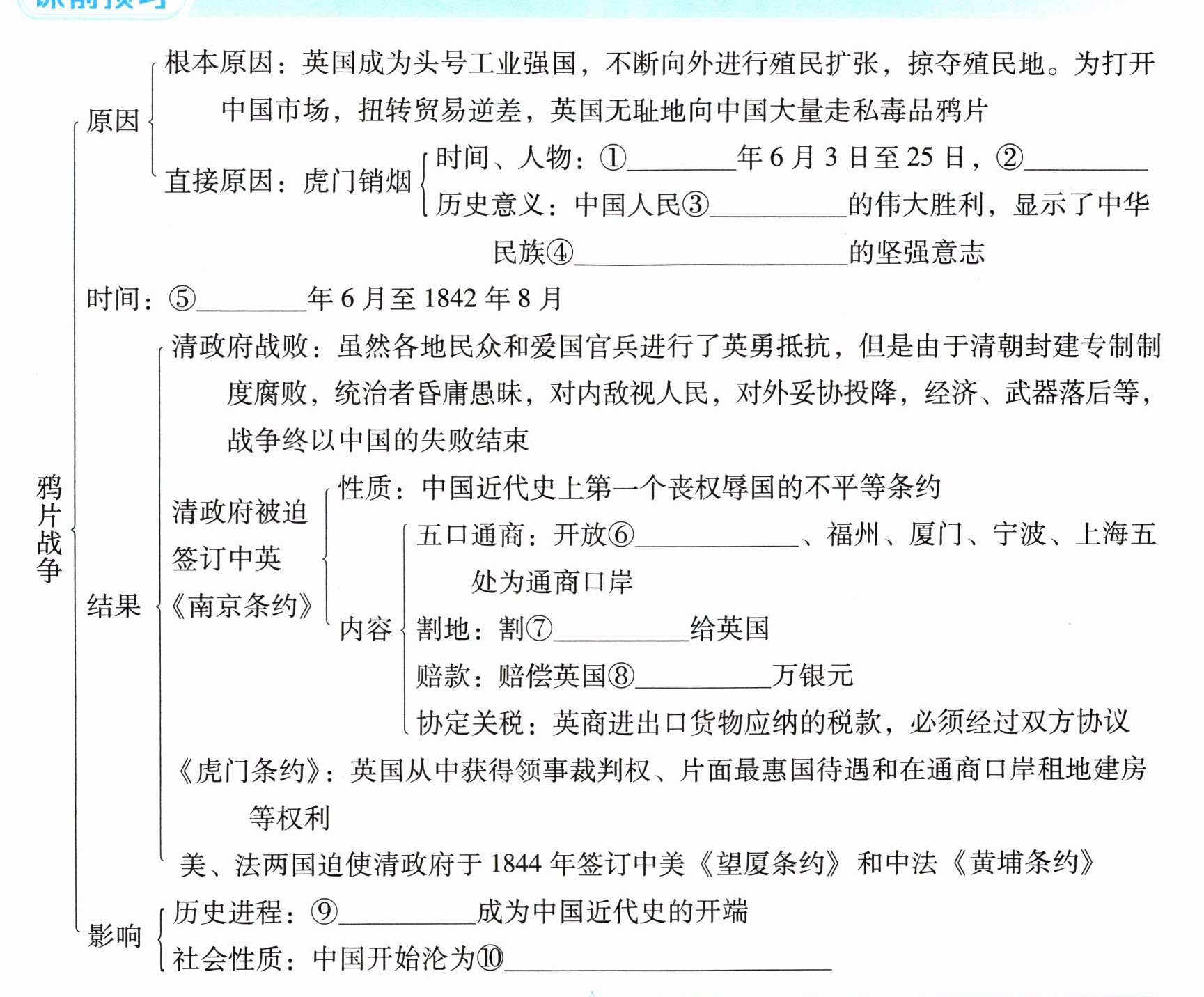 ①1839 ②林则徐 ③禁烟斗争 ④反抗外来侵略 ⑤1840 ⑥广州 ⑦香港岛 ⑧2100 ⑨鸦片战争 ⑩半殖民地半封建社会