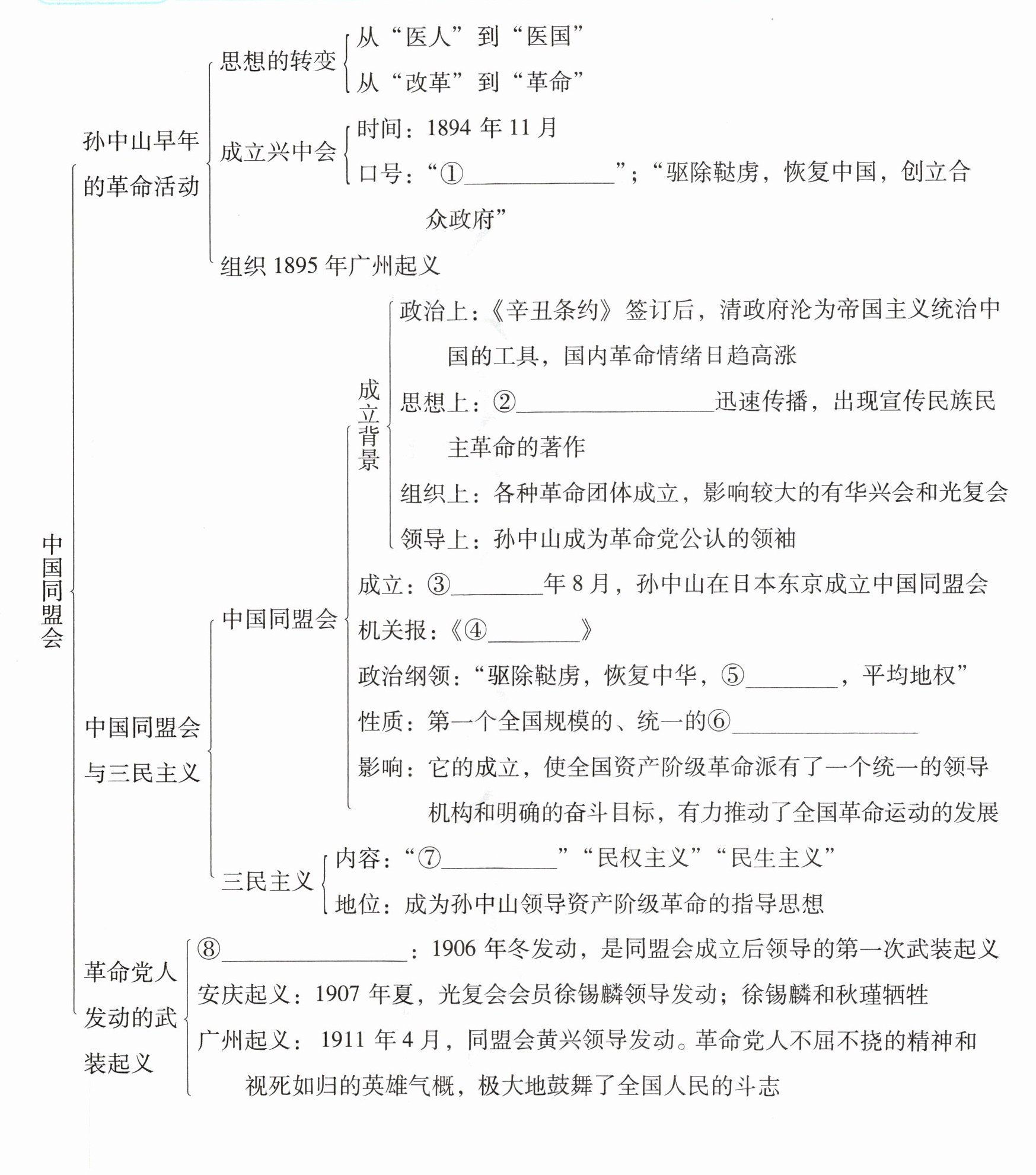 ①振兴中华 ②资产阶级革命思想 ③1905 ④民报 ⑤创立民国 ⑥资产阶级革命政党 ⑦民族主义 ⑧萍浏醴起义