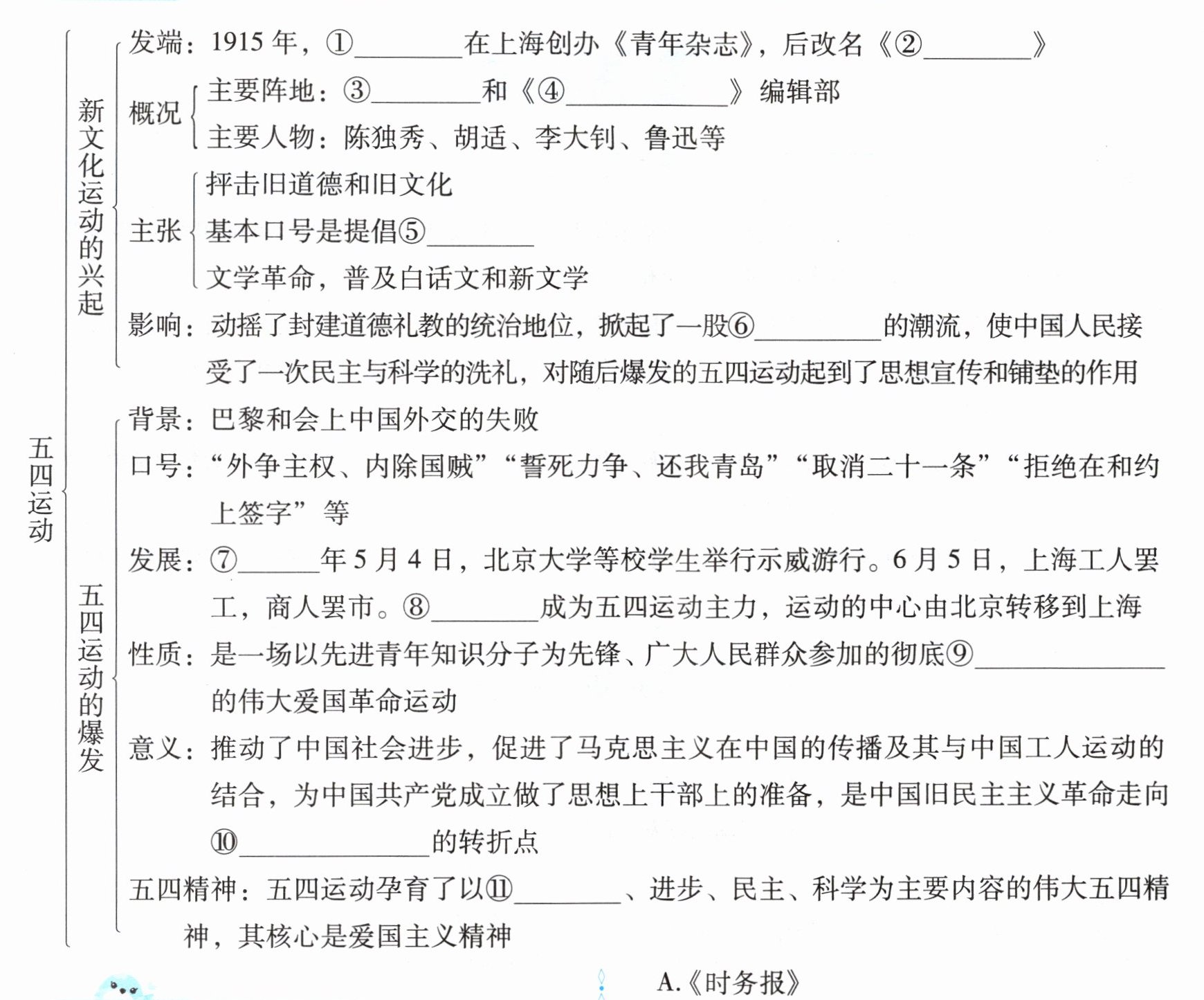 ①陈独秀 ②新青年 ③北京大学 ④新青年 ⑤民主和科学 ⑥思想解放 ⑦1919 ⑧工人阶级 ⑨反帝反封建 ⑩新民主主义革命 ⑪爱国