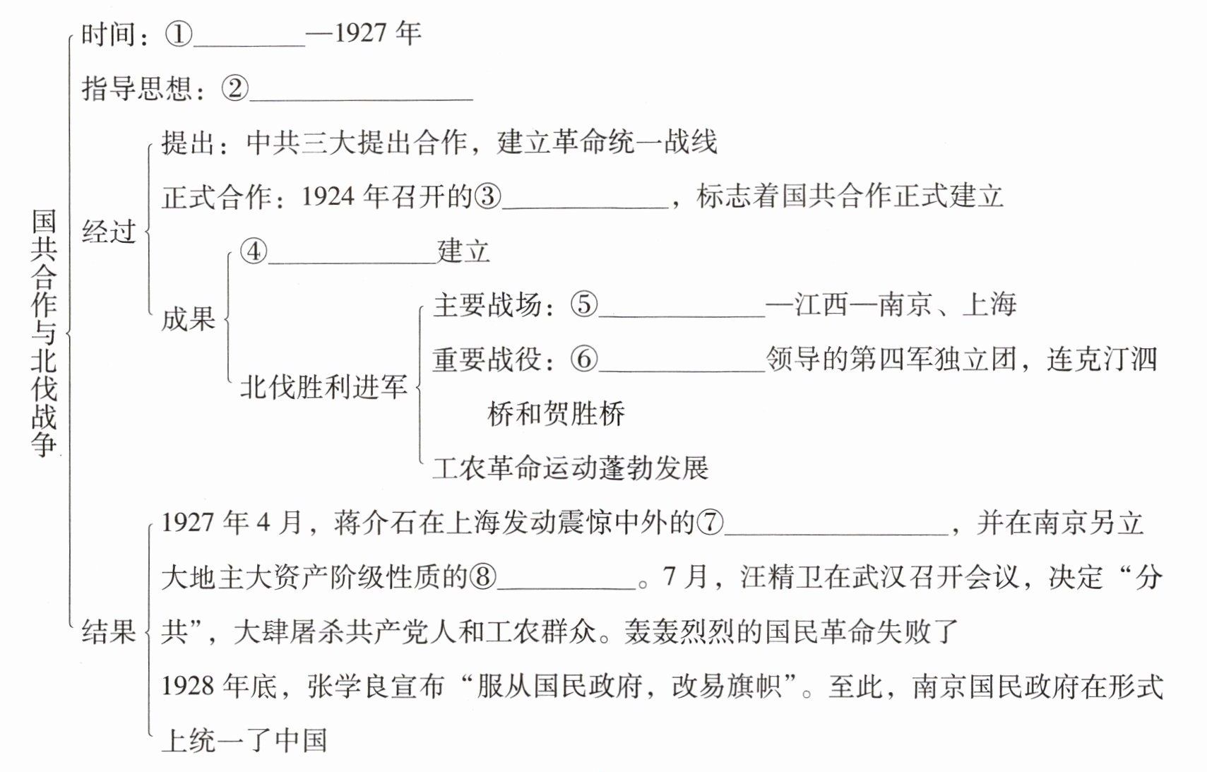 ①1924 ②新三民主义 ③国民党一大 ④黄埔军校 ⑤湖南、湖北 ⑥叶挺 ⑦四一二反革命政变 ⑧国民政府