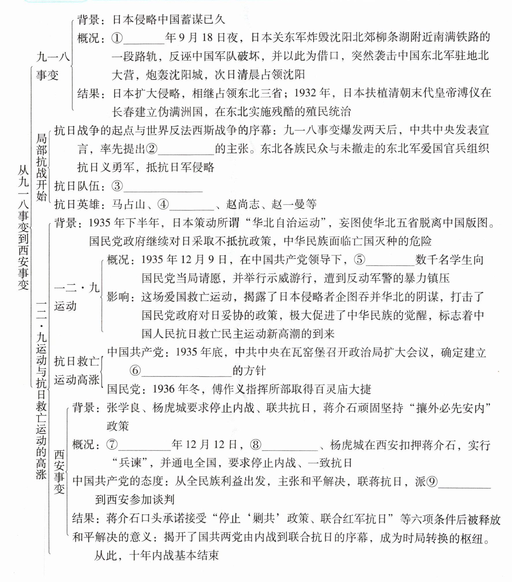 概况:⑦______年12月12日,⑧______、杨虎城在西安扣押蒋介石,实行“兵谏”,并通电全国,要求停止内战、一致抗日
