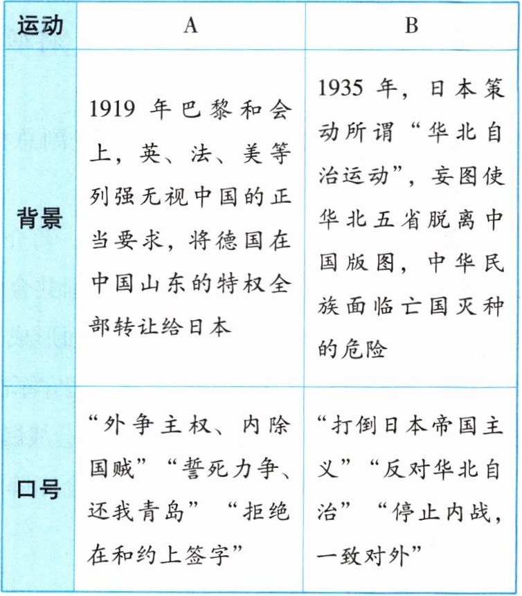 |口号|“外争主权、内除国贼”“誓死力争、还我青岛”“拒绝在和约上签字”|“打倒日本帝国主义”“反对华北自治”“停止内战,一致对外”|
