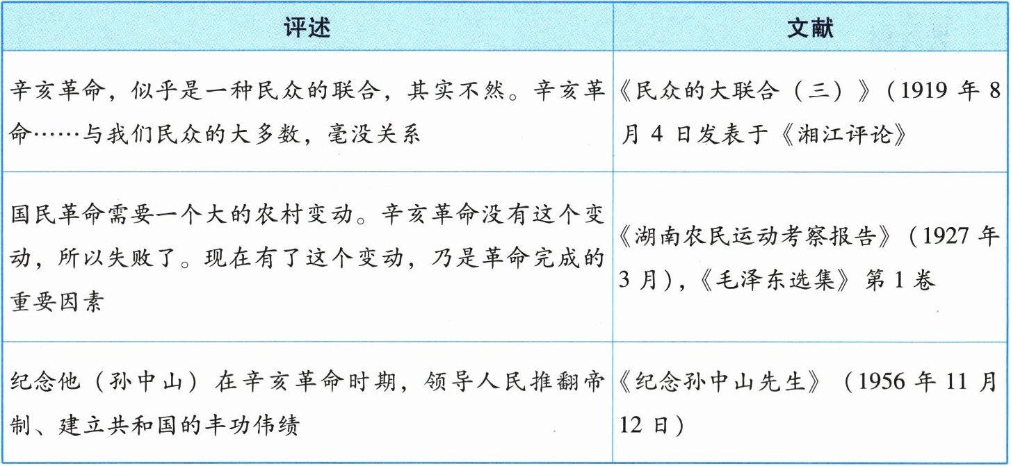 (1)理解:毛泽东"一分为二"地评述了孙中山和辛亥革命。一方面,毛泽东肯定了孙中山领导辛亥革命的历史意义,即辛亥革命推翻了清王朝的统治,宣告了中国两千多年君主专制制度的终结,拉开了中国完全意义上的近代民族民主革命的序幕。另一方面,毛泽东也分析了辛亥革命的局限性,即没有广泛的群众基础,没有充分联合和发动农民阶级等革命力量,从而没有完成民族独立、人民解放的历史任务。中国半殖民地半封建的社会性质没有改变。