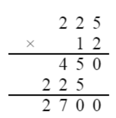 $\begin{array}{r r r}&&&&2&2&5 \\ ×&&&&&1&2 \\ \hline &&&&4&5&0 \rightarrow(