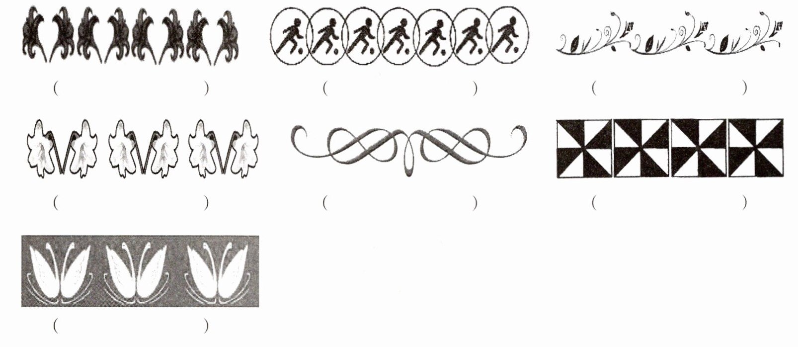 1. 圈出下面图案的基本图形,想一想是通过轴对称还是平移得到的,并写在括号里。