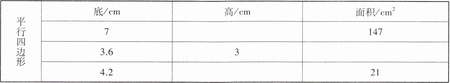 | 平行四边形 | 底/cm | 高/cm | 面积$/cm^2 $|