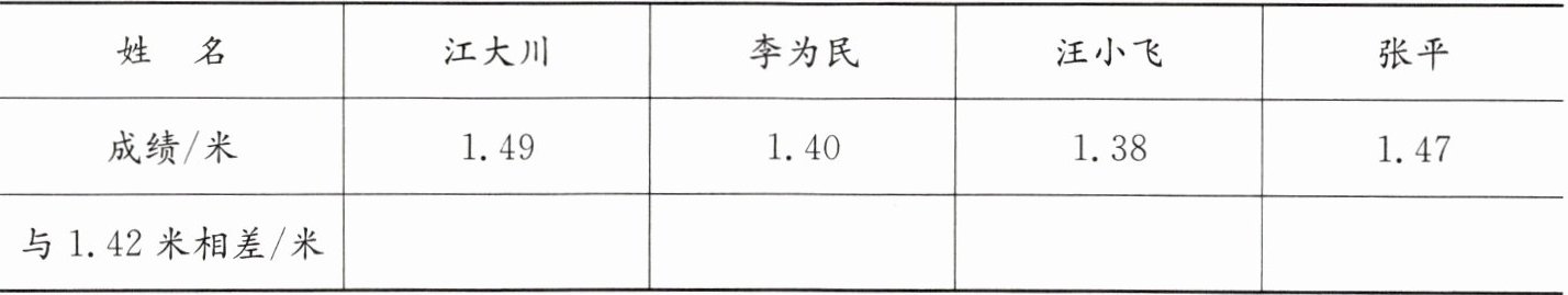 3. 五年级男生立定跳远成绩达到 1.42 米才算合格。下面这些同学的成绩与 1.42 米相比分别相差多少?用正数、负数或 0 表示这些数与 1.42 的差。