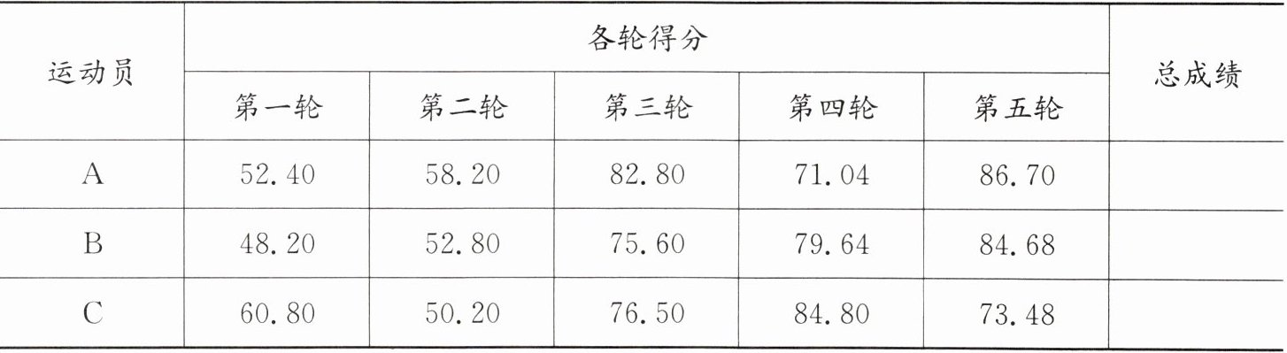 4. 在一次比赛中,三名跳水运动员 5 轮的得分如下表: