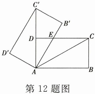 12. 如图,将矩形 $ ABCD $ 绕点 $ A $ 旋转至矩形 $ AB'C'D' $ 的位置,此时 $ AC $ 的中点恰好与点 $ D $ 重合,$ AB' $ 交 $ CD $ 于点 $ E $。若 $ AB = 3 $,则 $ \triangle AEC $ 的面积为(