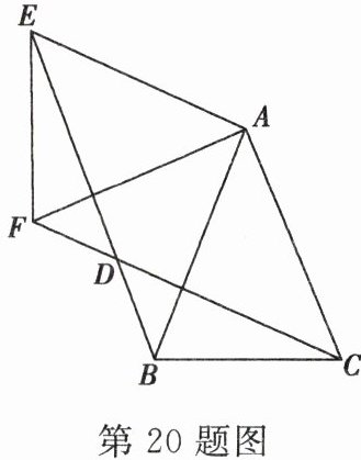 20. (10分)如图,在 $ \triangle ABC $ 中,$ AB = AC = 1 $,$ \angle BAC = 45° $,$ \triangle AEF $ 是由 $ \triangle ABC $ 绕点 $ A $ 按顺时针方向旋转得到的,连接 $ BE $、$ CF $ 相交于点 $ D $。