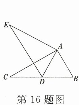 16. 如图,在 $ \triangle ABC $ 中,$ AB = 2 $,$ BC = 3.6 $,$ \angle B = 60° $,将 $ \triangle ABC $ 绕点 $ A $ 按顺时针旋转一定的角度得到 $ \triangle ADE $,当点 $ B $ 的对应点 $ D $ 恰好落在 $ BC $ 边上时,则 $ CD $ 的长为