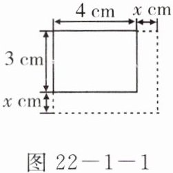 9. 如图 22-1-1,矩形的长是 4 cm,宽是 3 cm,如果将长和宽都增加$x\ cm$,那么面积增加$y\ cm^{2}$。