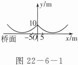 6. 如图 $ 22 - 6 - 1 $ 所示的是桥梁的两条钢缆,它们具有相同的抛物线形状图。按照图中的直角坐标系,左面的一条抛物线可以用 $ y = 0.0225x^{2} + 0.9x + 10 $ 表示,而且左右两条抛物线关于 $ y $ 轴对称。