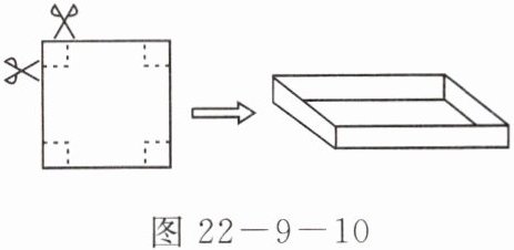 (1)如图22-9-10,若在正方形硬纸板的四角各剪掉一个同样大小的正方形,将剩余部分折成一个无盖的长方体盒子。