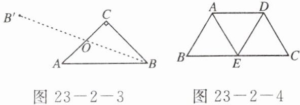4. 如图 23-2-3,在等腰直角三角形$ABC$中,$∠C= 90^{\circ},BC= 2cm$,如果以$AC的中点O$为旋转中心,将这个图形旋转$180^{\circ}$,点$B落在点B'$处,那么点$B'与点B$的距离为