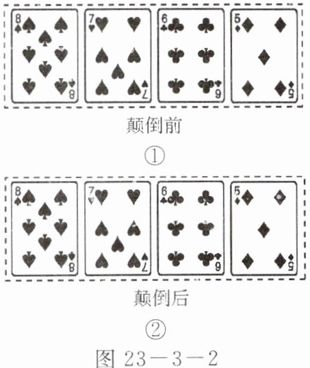 2. 小明把如图 23 - 3 - 2①所示的扑克牌放在一张桌子上,请一位同学避开他任意将其中一张牌倒过来,如图 23 - 3 - 2②,然后小明很快辨认出被倒过来的那张扑克牌是(