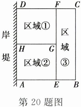20. (10分)为了节省材料,某水产养殖户利用水库的岸堤(岸堤足够长)为一边,用总长为80m的网围成了如图所示的①②③三块矩形区域,而且这三块矩形区域的面积相等。设 $ BC $ 的长度为 $ x $ m,矩形区域 $ ABCD $ 的面积为 $ y $ $ m^2 $。