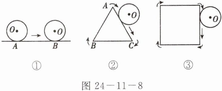 (2) 实验与计算:如图 24-11-8②、③,当$\odot O$ 与边长等于$\odot O$ 周长的三角形或正方形的一边相切时,将$\odot O$ 沿正三角形或正方形周边滚动(无滑动)回到初始位置,分别求出圆心 $O$ 移动的路程;