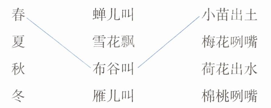 1.春 蝉儿叫 小苗出土 夏 雪花飘 梅花咧嘴 秋 布谷叫 荷花出水 冬 雁儿叫 棉桃咧嘴 2.② ① ②