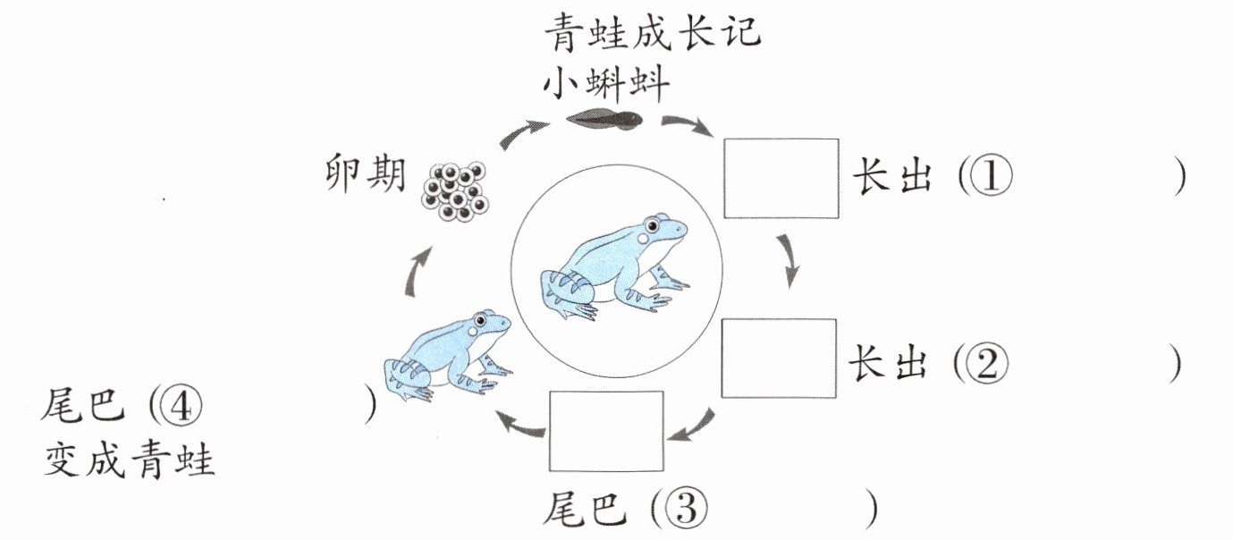 六、你知道小蝌蚪是怎样长成青蛙的吗?填一填,画一画吧。