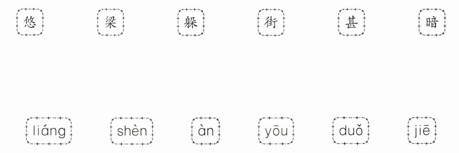 悠——yōu 梁——liáng 躲——duǒ 街——jiē 甚——shèn 暗——àn