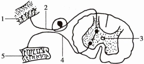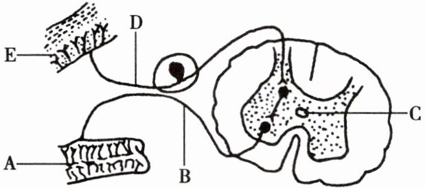 14. 如图是反射弧模式图,已知图中A为人体某块肌肉。请写出图中五个结构的名称。