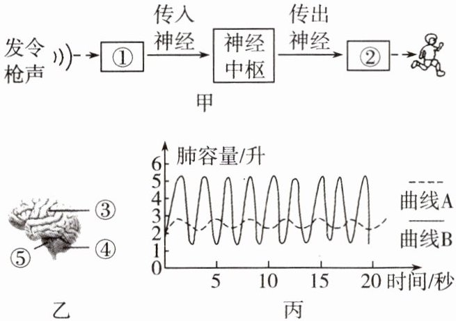 9. (长春)(节选)2024年6月2日,“心无界 步边疆”吉林边境森林马拉松系列赛首站比赛在吉林省珲春市举行。随着一声发令枪响,选手们从起点鱼贯而出,奔跑在山水之间。图甲为从枪声响起到起跑的过程示意图,图乙为脑的组成示意图,图丙为人在两种不同状态下的呼吸情况曲线图。据图回答问题: