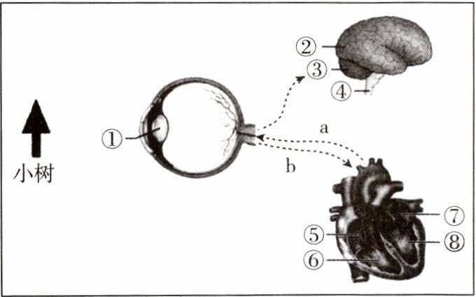 (2)为眼球提供营养物质和氧的血管a属于____(填“动脉”或“静脉”),其中流动着颜色鲜红的____血。眼部细胞产生的废物通过血管b,先流回心脏的⑤____,然后随血液循环运走。