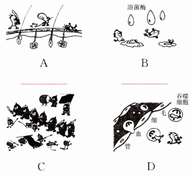 27. 图中四幅漫画寓意人体免疫的三道防线,请分析图片回答下列问题。
