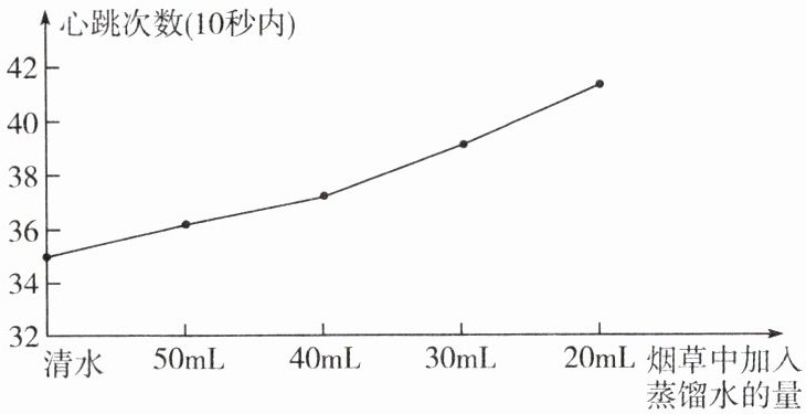 12. 银鱼是一种身体呈半透明的小鱼,为了宣传烟草对健康的危害,不做“校服烟民”,兴趣小组的同学利用银鱼进行了烟草浸出液对银鱼心率影响的实验:①向装有等量香烟烟丝的 4 个烧杯中分别加入 20mL、30mL、40mL、50mL 的蒸馏水,浸泡 1 天,制成不同浓度的烟草浸出液;②取 20 条大小一致、生命力旺盛的银鱼分成 5 等份,分别移入等量的蒸馏水及不同浓度的烟草浸出液中;③5 分钟后,测量每条银鱼 10s 内的心跳次数,重复 3 次,分别计算出平均值,绘成曲线图。下列分析错误的是( )