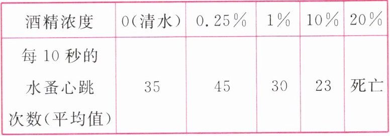 9. 为了解不同浓度的酒精对水蚤心率的影响,生物小组进行实验探究,得到以下数据:
